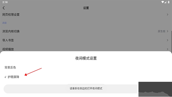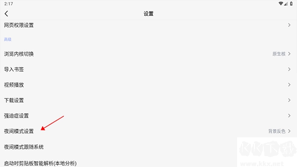 我们要在设置里找到夜间模式的相关设置项,然后点击其右侧的背景反色功能按钮。