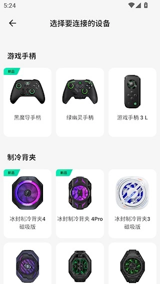 选择要连接的设备,包括手柄、散热器、耳机等