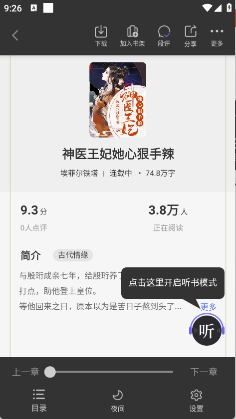 点开想看的小说进入详情页面,点击“免费阅读”。