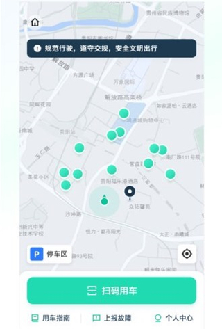 进入后就能看到附近共享车辆的位置,要是车辆就在身边,直接扫描就能解锁使用。
