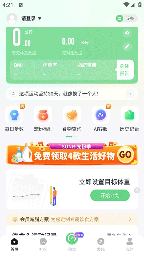 Sunri App是一款依托智能蓝牙设备,为您提供体重测量、体围记录、运动记录、个性化体重目标规划、趋势变化及身体指标分析服务的应用;它还能推荐科学的减肥饮食食谱,搭配喝水、经期、睡眠等实用工具,助力您养成健康生活习惯,记录每一次成长与改变。此外,平台还设有饮食、减肥、运动相关的科普知识分享区和社区动态打卡功能,您可以与数千万热爱生活的用户一同见证精彩的蜕变历程。