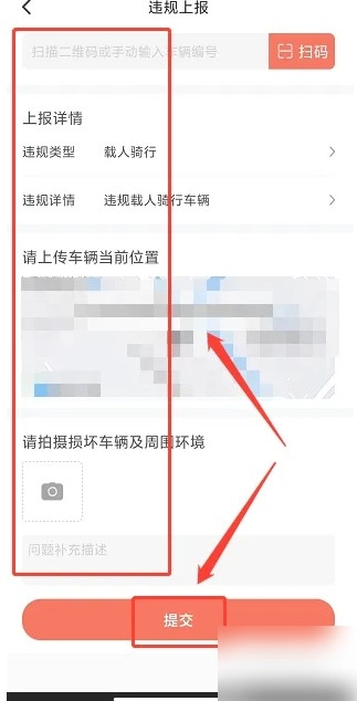 第三步,进入违规上报界面,依次输入车辆编号,选择上报类型、填写违规详情及问题补充描述,之后点击【提交】选项,完成违规上报的提交操作。