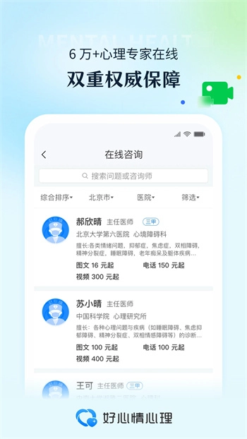 好心情心理是一款专业的健康咨询类软件,用户能在这里体验到专业化的心理咨询模式,借助心理咨询来改善心情状态。软件配备了基础问答功能,用户可在任意时段向专家提问,以此初步了解自身是否存在心理问题。此外,用户还能通过拨打电话等方式进行咨询,享受更为便捷的心理查询服务。
