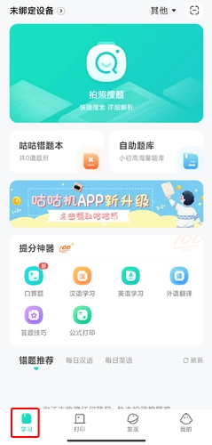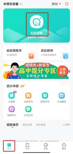 学习页面具备丰富多样的功能,其中涵盖拍照搜题、咕咕错题本、自助题库,以及针对其他科目的提分神器。