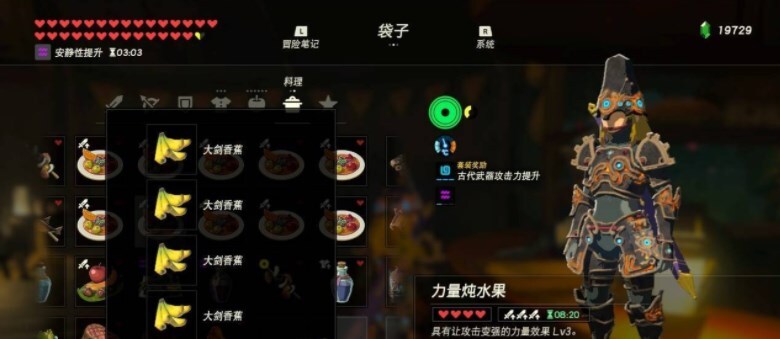 其次是力量炖水果,加攻击力的配方如下:用4个大剑香蕉能制作出3级攻击料理;如果条件允许,也可以用4个大剑香蕉搭配1个龙角,这样料理的持续时间会显著延长。
