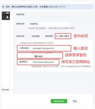 3、按页面要求填写信息:在菜单内容处选择跳转小程序,填入小程序路径为packageList/pages/index ,在小程序搜索栏选择“慧享智控”,并填写备用网页为“酒店/公寓自己的”。