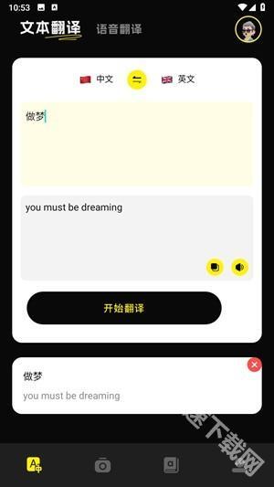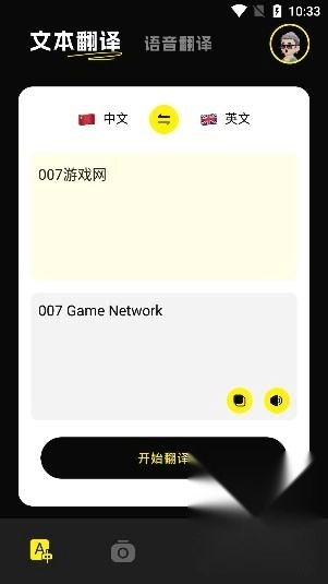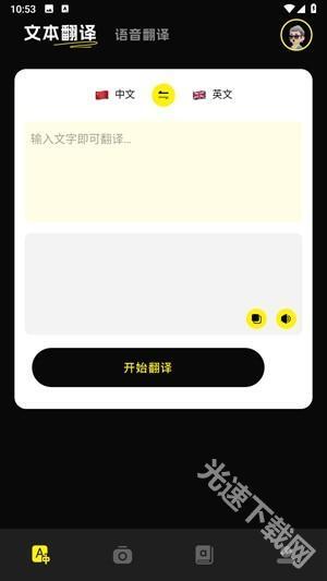 打开软件后直接进入首页的翻译功能界面,在上方的输入框中填写需要翻译的文字,然后点击“开始翻译”按钮即可。
