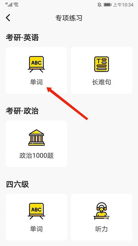 进入单词专项练习界面,选择“单词”选项,