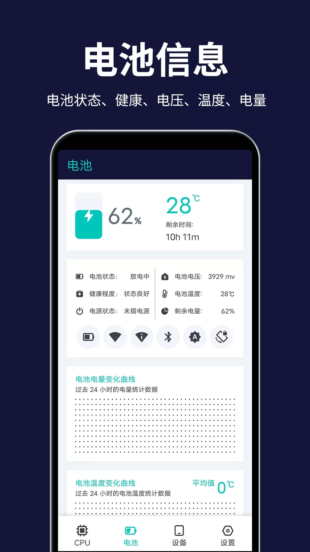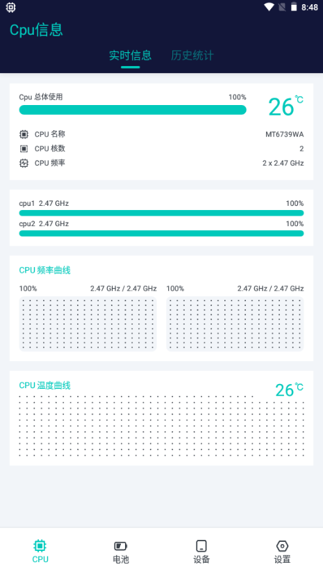 CPU设备信息软件里最关键的功能当属CPU实时监控,在排查手机异常状况时特别实用,毕竟我们可以从变化曲线中直观地找出问题根源。此外,使用这款CPU设备信息工具无需进行root操作,大大保障了手机的安全性!