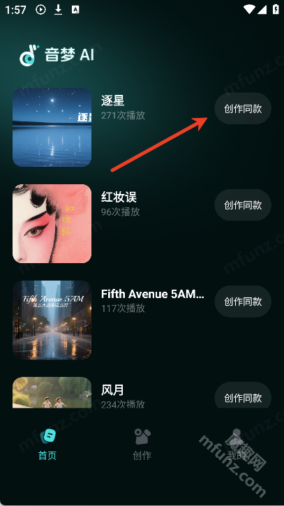音梦AI音乐创作软件提供多种歌曲风格任你挑选,只需输入歌曲主题或歌词,选定风格与情绪,短短三秒就能生成专属于你的音乐作品。当你缺乏灵感时,不妨参考模板库里那些悦耳的歌曲,点击“做同款”按钮,就能迅速制作出同款歌曲啦!