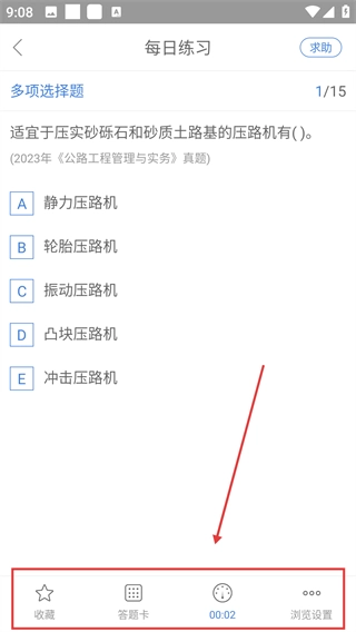 进入每日练习页面做题时,你可以点击底部的【答题卡】查看练习进度,通过【收藏】功能保存题目,同时也能看到计时情况哦。