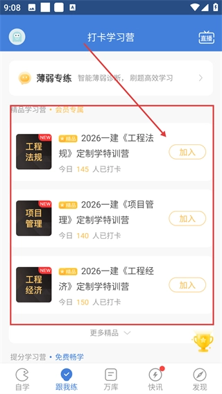 在跟我练页面可以看到多个打卡学习营,比如【2026一建《工程法规》定制学特训营】,点击就能查看详情啦。