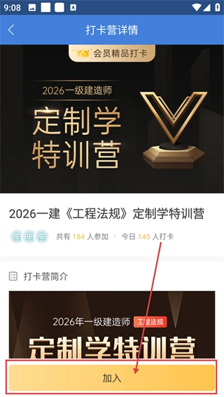 进入打卡营详情页面后,先确认这是你想参与的训练营,然后点击页面底部的【加入】按钮,就能成功加入该学习营了。