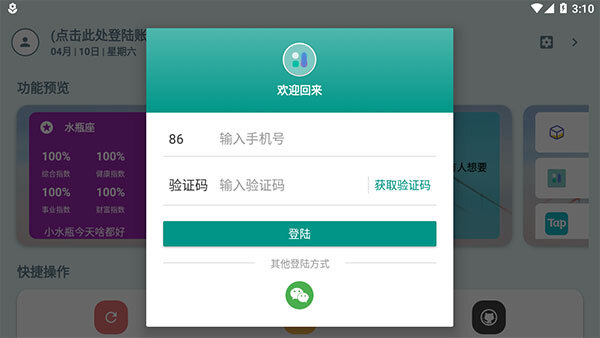在首页,你能看到各类功能模块。若要登录,点击首页左上方的头像图标,输入手机号码与验证码即可,也可以通过点击微信实现一键登录。