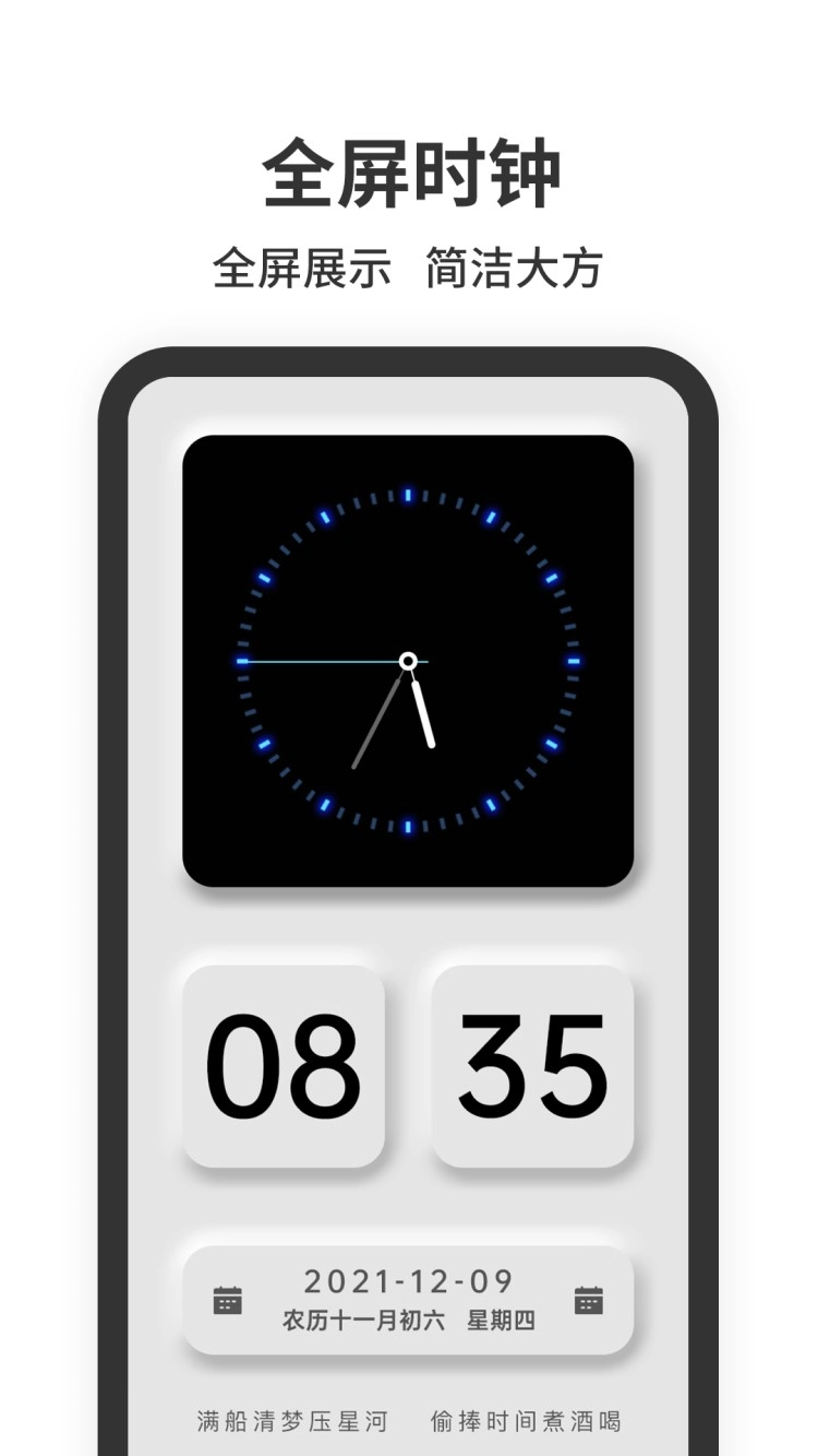 启动本站的悬浮时钟后,进入主界面就能看到全屏时钟、悬浮时钟、定时闹钟等功能选项。