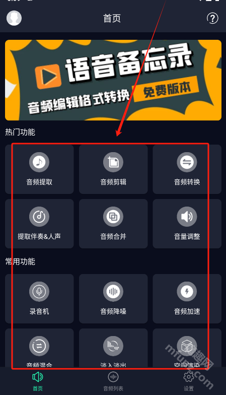 进入首页,能看到“音频提取”“音频剪辑”“音频转换”“音频合并”“音频降噪”等多种功能。