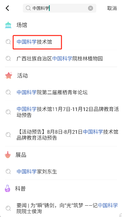 然后在搜索结果里找到对应的科技馆,点击进入详情页面。