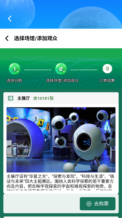 挑选好你想要前往的场馆,添加观众信息,提交订单并完成支付,这样就预约成功了。