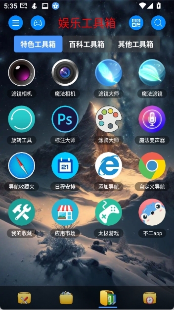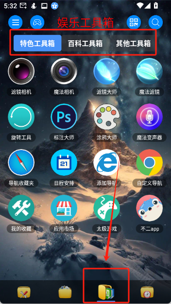 点击首页底部第三个文档图标,就能看到里面包含了各类娱乐工具箱,像相机、日历、模拟乐器弹奏等功能都在其中。