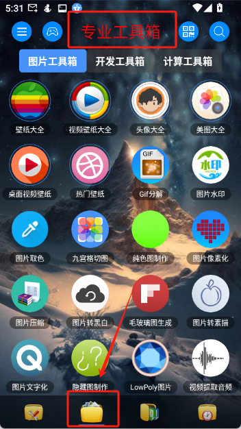 首页底部的第二个图标,为大家提供了各类专业工具箱,像图片工具箱、开发工具箱、计算工具箱都包含在内。