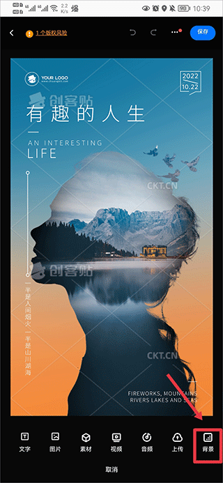 你可以点击界面右下角的“添加”按钮,接着滑动选项列表找到“背景”选项并选中,然后从中挑选一个合适的背景。