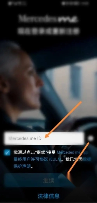 打开梅赛德斯-奔驰客户端,输入您的ID,接着点击“继续”按钮。