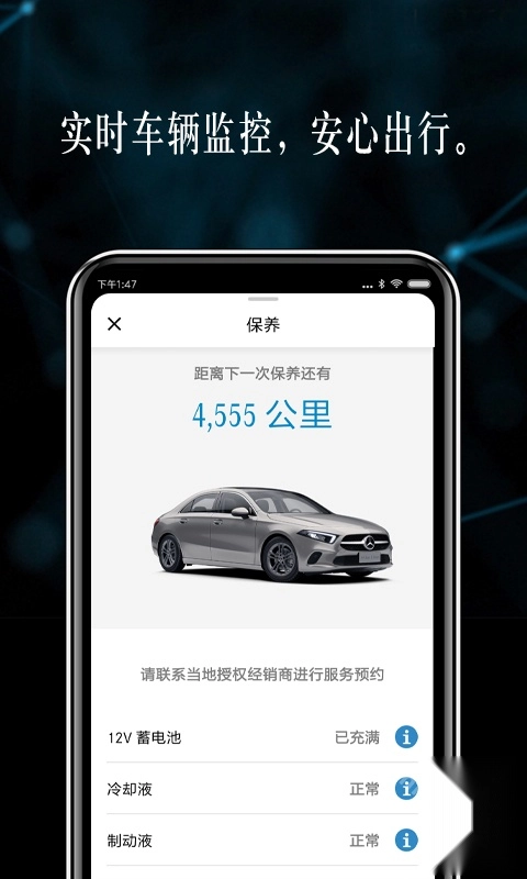 车辆状态查看:支持实时监控,让您全面掌握车辆动态。您可随时查看车辆的实时位置、当前状态以及各配件的运行情况,系统还会根据车辆使用数据提供节能建议,为您的安心出行保驾护航。