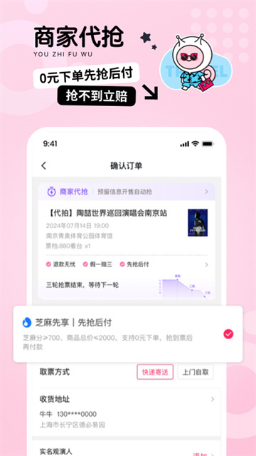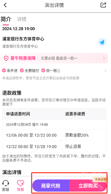 在演出详情页中点击商家代抢或立即购买