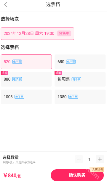 接着挑选场次、票档和需要购买的数量,点击确认购买,最后完成付款就可以了。