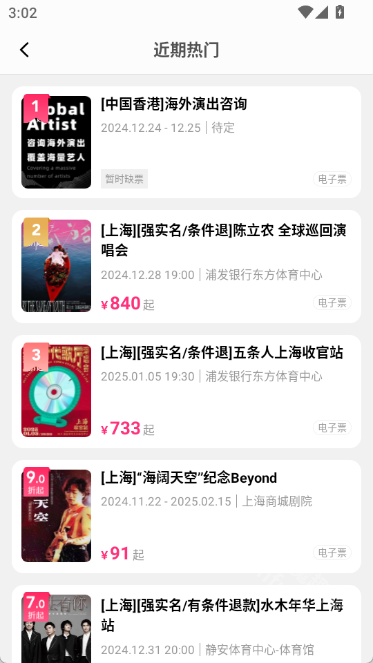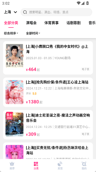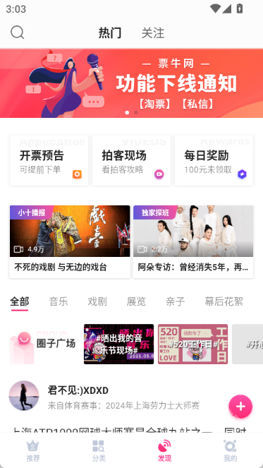 每月都会定期推出精彩活动,各类优惠福利持续不断:折扣演出、1元限时抢购,还有周杰伦、陈奕迅、五月天演唱会的稀缺门票,都在等着你来抢!