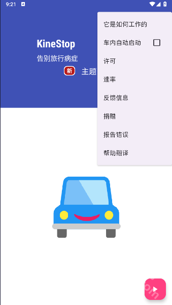 KineStop是一款比想象中更实用的防晕车护眼神器。尽管KineStop手机版最新版的界面看起来较为简陋,但其提供的功能和服务却十分实用。这款KineStop晕车辅助工具可借助手机传感器实时监测车辆的加速度与方向变化,进而自动调节手机屏幕亮度并提供相应的视觉辅助,即便在车上玩手机也不用担心晕车了!