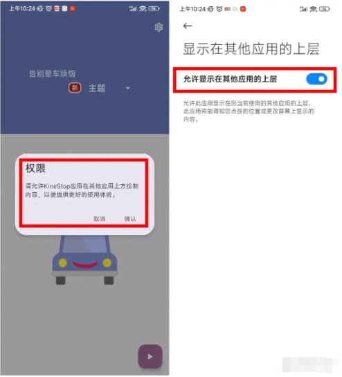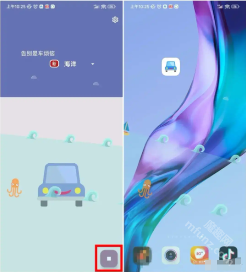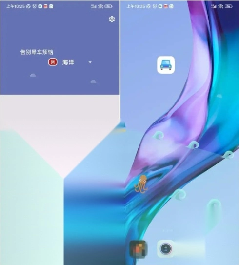 例如,这里选择海洋主题后,点击右下角的播放按钮就能启动软件。此时,当我们使用手机时,手机屏幕上会浮现半透明的图案,这些图案会随着汽车的行驶呈现出颠簸浮动的动态效果。