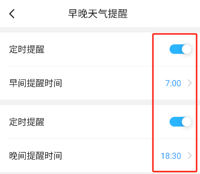 打开早间与晚间的提醒功能,并设置好全天的提醒时间。