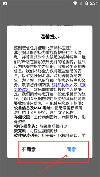 使用北京胸科医院应用前,请仔细阅读【温馨提示】里的【隐私协议】与【服务协议】,阅读完毕后点击【同意】按钮,就能进入接下来的流程。