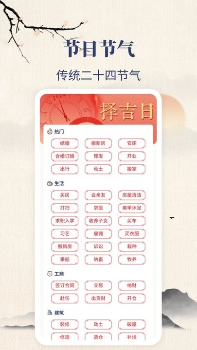 国内外的传统节日与中国二十四节气,我们不仅会为您标注日期并设置提醒,还会提供国家法定节假日的上班时间调整信息。更贴心的是,我们还准备了详细的科普介绍,助您深入了解节日与节气背后的文化内涵,尽情感受传统文化的独特魅力。