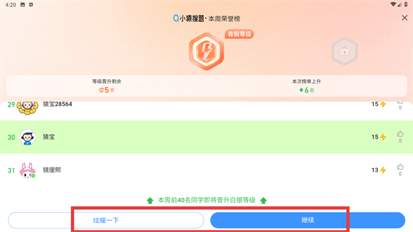 完成PK后,可在本周荣誉榜页面查看排名变动情况,点击【炫耀一下】分享自己的成绩,也能点击【继续】参与下一轮对战。