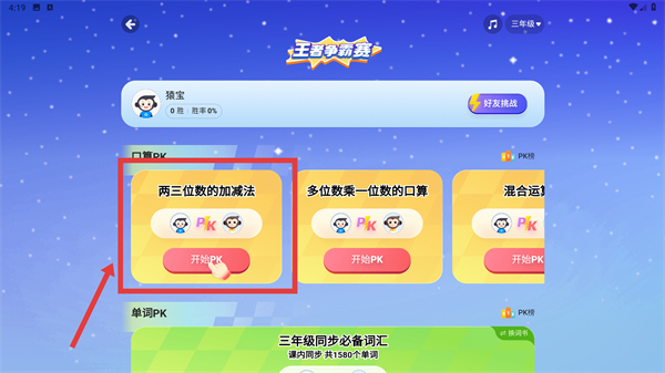在口算PK页面,选择【两三位数的加减法】这一题型,点击【开始PK】按钮,即可进入对应的口算对战环节。