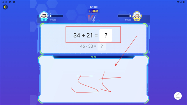 在对战答题的界面里,算出“34+21”这道题的结果,接着在下方的书写区域中输入答案“55”,这样就完成了这道题的作答。