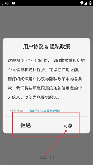 在阅读《用户协议与隐私政策》后,点击弹窗内的【同意】按钮以完成协议确认,这是使用“云上写作”前必须完成的前置步骤。