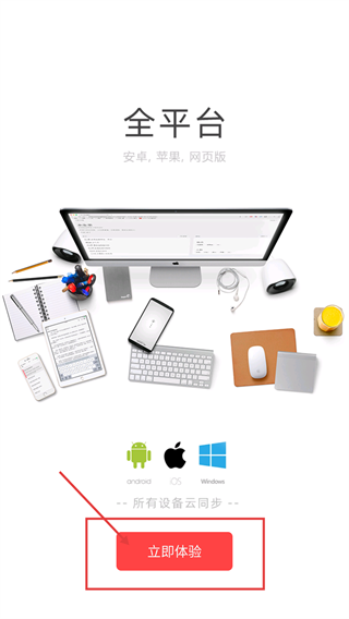 在全平台介绍页面点击【立即体验】按钮,该页面呈现了“云上写作”具备安卓、iOS、Windows等设备云同步功能的特性。