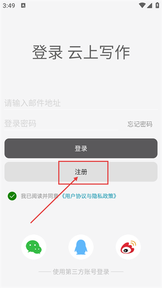 进入登录界面后,点击【注册】按钮,此页面除了支持邮箱密码登录外,还提供微信、QQ、微博等第三方账号登录方式。
