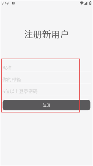 进入新用户注册页面后,按顺序填写【昵称】和【你的邮箱】,设置长度不少于6位的登录密码,最后点击【注册】按钮即可完成账号注册。