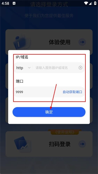 在登录方式选择页面,点击常规登录选项后,会弹出用于输入IP或域名的相关窗口。