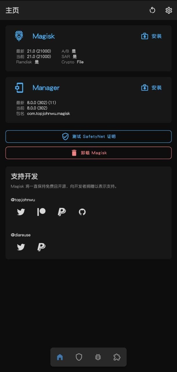 提供直观的状态面板,实时展示Magisk版本、Root状态以及SafetyNet认证情况。
