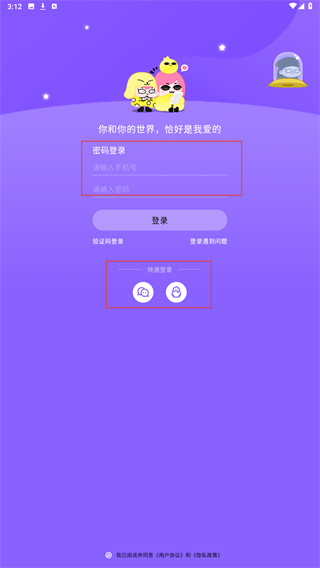 选择密码登录方式时,需填写【请输入手机号】和【请输入密码】;也可选择【快速登录】中的微信或QQ方式,以完成账号登录。