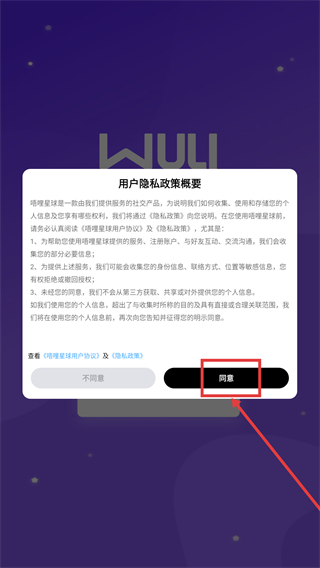 在阅读【用户隐私政策概要】的内容之后,请点击【同意】按钮,以此确认您接受《唔哩星球用户协议》与《隐私政策》,随后即可进入后续的流程。