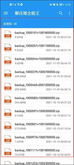 3、随后,软件将自动扫描你手机上的全部压缩包文件。接着挑选你打算解压的压缩包。