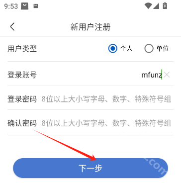 首先选择用户类型,若是个人用户就选“个人”,非个人用户则选“单位”;接着依次输入账号、密码和确认密码,之后点击“下一步”按钮;最后按照页面提示完成后续操作即可。需要注意的是,设置的密码需满足8位以上,且必须包含大小写字母、数字和特殊符号的组合。