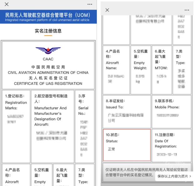 在底部菜单栏找到【我的】-【我的无人机】,就能看到已申请的实名登记号和实名产品信息,状态显示为(正常)。