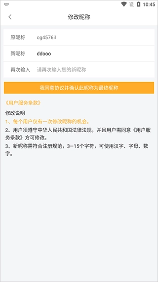 5、当进入修改昵称界面,在此界面输入新的昵称,随后点击同意协议,如此便完成昵称修改。